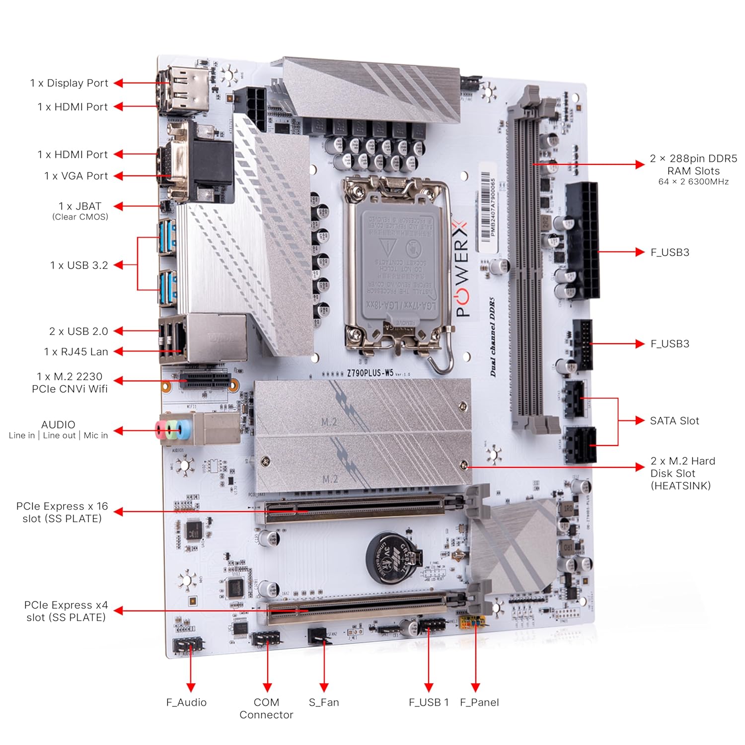 - CPU Compatibility : LGA 1700 12th, 13th, and 14th Gen RAM Support : 64GB+64GB DDR5 Memory Upto 6400 MHz Connectivity : DP | 2xHDMI | VGA | 4xUSB 3.2 | 2xUSB 2.0 | 2.5Gig Lan | 3 in 1 Audio Expansion Slots : M.2 PCIe CNVi Wifi Slot | 2 x NVMe Slot | 2 x PCI-Express x16 Slots Chipset : Z790 Chipset + AMI EFI Bios Size : Micro ATX (22 x 24cm)
